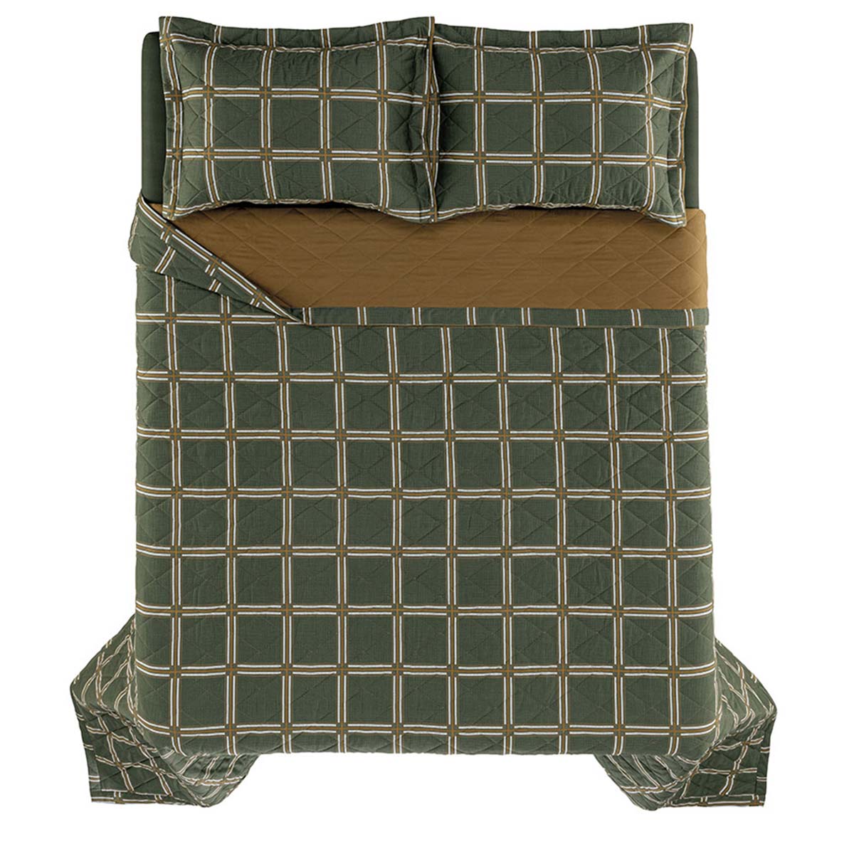 Confeccionada em 100% algodão egípcio de fibra longa e 300 fios com enchimento thermobonder 100% poliéster com gramatura de 120g/m². Bernardo se destaca pela estampa contemporânea de presença marcante. Sua colcha e o porta-travesseiro dupla face apresentam um desenho geométrico formado pelo encontro de listras, com predominância da cor verde, enquanto o verso tinto preserva o tom bronze. O porta-travesseiro ganha sofisticação com três abas laterais, valorizando o acabamento da peça. Todos os itens recebem tratamento termobond, que evita deformações e garante maior durabilidade. Com visual acetinado e toque macio, o jogo de colcha Bernardo preenche o quarto e envolve o ambiente em conforto. As costuras em matelassê reforçam as camadas, unindo o enchimento ao tecido para um acabamento elegante e duradouro. Foto meramente ilustrativa. Contém: 1 colcha 220x260cm 2 porta-travesseiros 50x70cm INSTRUÇÕES DE LAVAGEM KARSTEN • Lavar com temperatura máxima de 60°C; • Não alvejar; • Secar em tambor com temperatura máxima de 60ºC; • Passar com temperatura máxima de 150ºC; • Não limpar a seco; Dicas de conservação Catran: - Siga sempre as instruções de lavagem e conservação dispostas na etiqueta ou embalagem do produto. Colcha Casal 300 Fios Bernardo - Karsten De R$ 719,00 Por R$ 683,05 vista com 5% de desconto no boleto/pix R$ 719,00no carto em at 10x de R$ 71,90