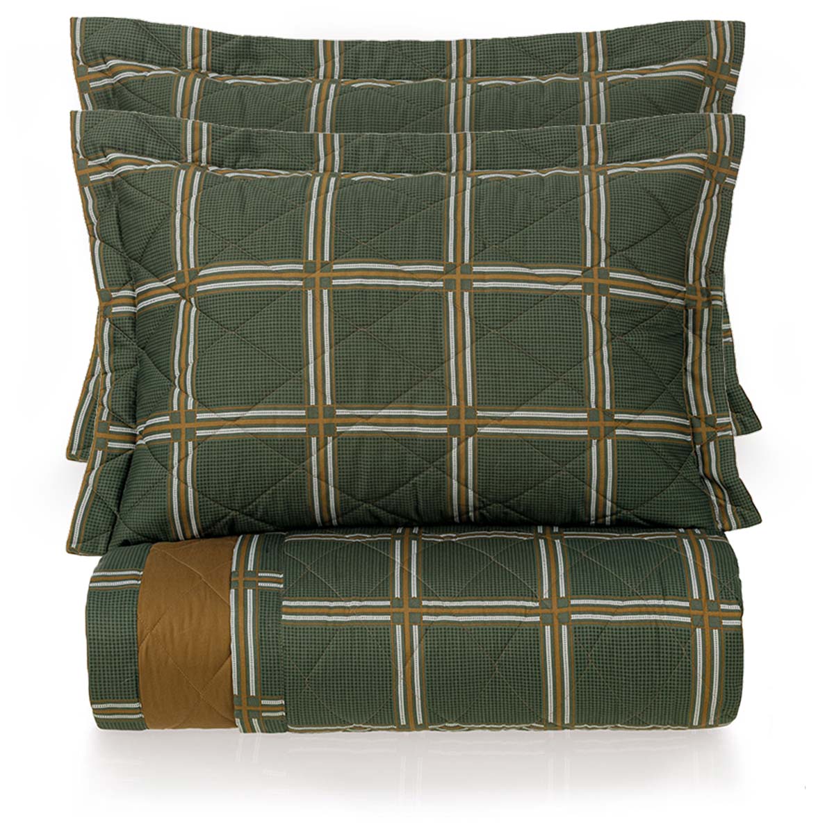 Confeccionada em 100% algodão egípcio de fibra longa e 300 fios com enchimento thermobonder 100% poliéster com gramatura de 120g/m². Bernardo se destaca pela estampa contemporânea de presença marcante. Sua colcha e o porta-travesseiro dupla face apresentam um desenho geométrico formado pelo encontro de listras, com predominância da cor verde, enquanto o verso tinto preserva o tom bronze. O porta-travesseiro ganha sofisticação com três abas laterais, valorizando o acabamento da peça. Todos os itens recebem tratamento termobond, que evita deformações e garante maior durabilidade. Com visual acetinado e toque macio, o jogo de colcha Bernardo preenche o quarto e envolve o ambiente em conforto. As costuras em matelassê reforçam as camadas, unindo o enchimento ao tecido para um acabamento elegante e duradouro. Foto meramente ilustrativa. Contém: 1 colcha 290x260cm 2 porta-travesseiros 50x70cm INSTRUÇÕES DE LAVAGEM KARSTEN • Lavar com temperatura máxima de 60°C; • Não alvejar; • Secar em tambor com temperatura máxima de 60ºC; • Passar com temperatura máxima de 150ºC; • Não limpar a seco; Dicas de conservação Catran: - Siga sempre as instruções de lavagem e conservação dispostas na etiqueta ou embalagem do produto. -30%