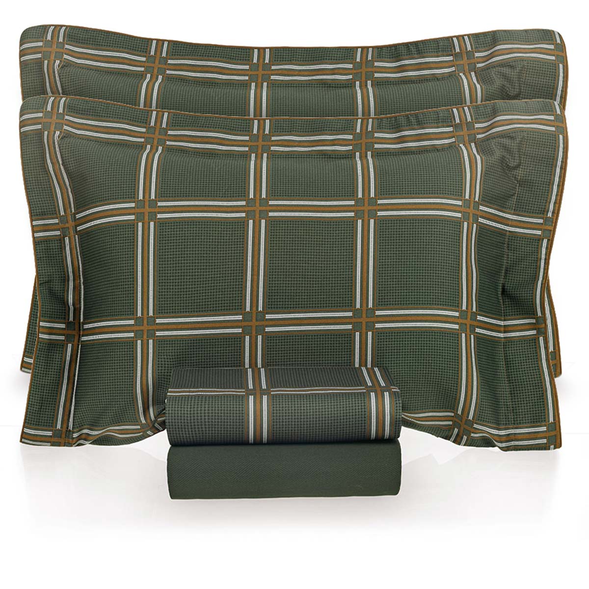 De toque supremo com experiência sensorial do cetim 300 fios, confeccionado em 100% algodão egípcio de fibras longas. Esse tecido sedoso, de toque extremamente macio e com cintilância natural, por conta do entrelaçamento dos fios; além disso, sua estrutura maleável proporciona um caimento perfeito na cama. O algodão egípcio tem propriedades hipoalergênicas e altamente respiráveis, que regulam a temperatura corporal e proporcionam uma noite de sono perfeita. Suas fibras longas impedem a formação de bolinhas e garantem fios mais finos, criando um tecido muito mais suave e confortável. Bernardo se destaca pela estampa contemporânea de presença marcante. Com um desenho geométrico formado pelo encontro de listras, com predominância da cor verde com detalhes em tom bronze. Com sobre lençol estampado com dobra feita e bainha de 3cm, lençol com elástico estampado e fronhas estampada com 3 abas de 7cm, verso tinto e cordonê bronze aplicado. Com caimento perfeito do cetim, Bernardo une a naturalidade do desenho feito à mão à sofisticação de um design único. Foto meramente ilustrativa. Contém: 1 lençol de cima 290x260cm 1 lençol ajustável 193x203x45cm 2 fronhas 50x70cm INSTRUÇÕES DE LAVAGEM KARSTEN • Lavar com temperatura máxima de 40°C; • Não alvejar; • Secar em tambor com temperatura máxima de 60ºC; • Passar com temperatura máxima de 150ºC; • Não limpar a seco; Dicas de conservação Catran: - Siga sempre as instruções de lavagem e conservação dispostas na etiqueta ou embalagem do produto. -36%