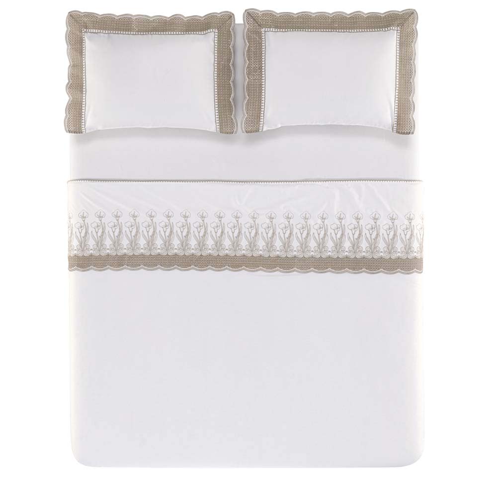 Confeccionado em tecido sanforizado e mercerizado 100% Algodão Egípcio, cetim 300 fios. Martorana é uma celebração da herança cultural e gastronômica da Sicília. Inspirado na beleza das tulipas que enfeitam os doces sicilianos, como as famosas cassatas, seus bordados evocam a delicadeza artesanal que atravessa gerações. Seu jogo de cama 4 peças é composto por sobre lençol, lençol com elástico estampado e duas fronhas com acabamento refinado em tira bordada e canto inglês. Seu tecido sanforizado e mercerizado, proporciona um toque sedoso e brilho sutil. Uma composição que desperta memórias doces e convida a transformar o descanso em uma experiência de leveza e bem-viver. Foto meramente ilustrativa.