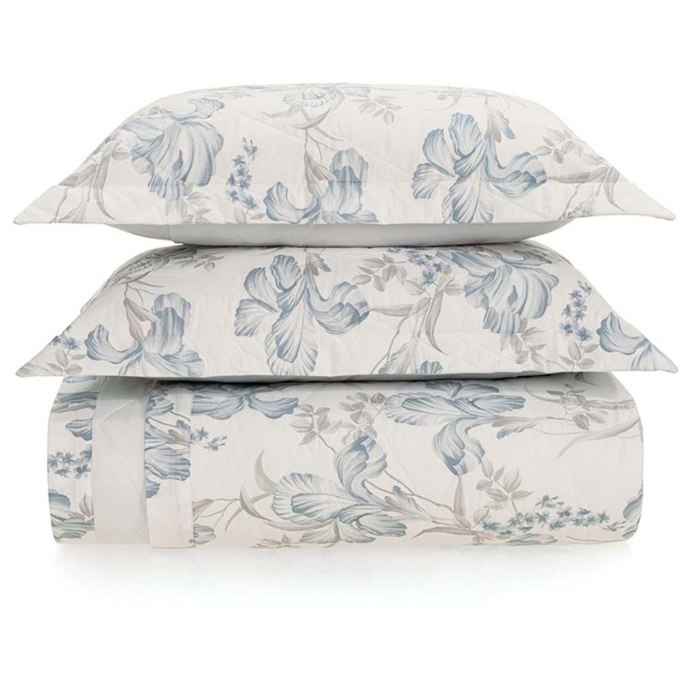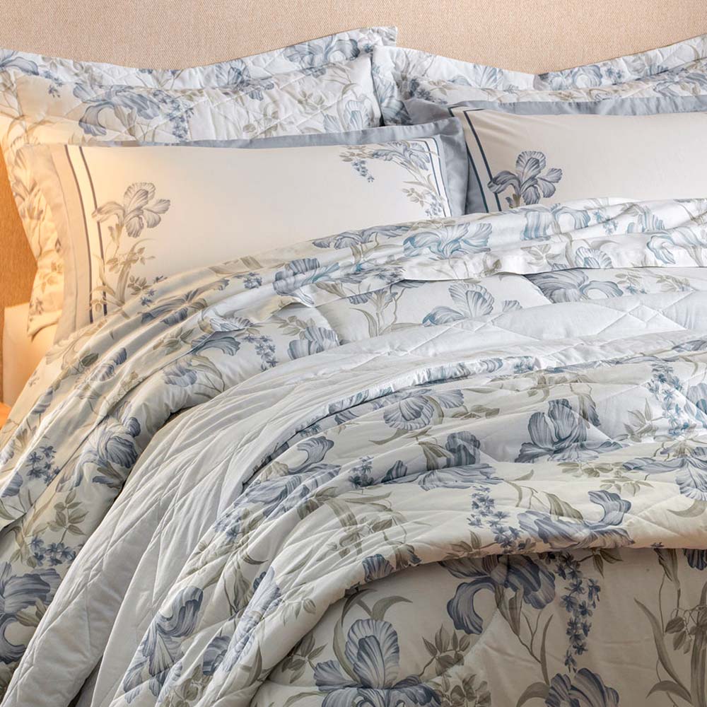 Confeccionada em tecido mais encorpado e macio 100% Algodão Soft, Fio Penteado, Percal 200 fios e enchimento thermobond 100% poliéster com gramatura de 120g/m², conferindo toque macio, confortável com excelente qualidade. Um toque de arte para seu momento de descanso. A colcha Catarina da Karsten, traz em seu tecido, uma arte criada por nossos desenhistas retratando flor azul com ramos e folhas verdes com o fundo branco e verso com linhas verticais e horizontais. Essa combinação de tons suaves, compõem um ambiente tranquilo e acolhedor para uma deliciosa noite de sono. Seu toque Soft proporciona o máximo de conforto e garante maciez e qualidade incomparáveis. É altamente respirável, hipoalergênico e antipilling deixando suas noites ainda mais aconchegante. Colcha dupla face com cantos quadrados e porta-travesseiros com 3 abas de 5 cm. perfeita para adornar sua cama! Foto meramente ilustrativa.