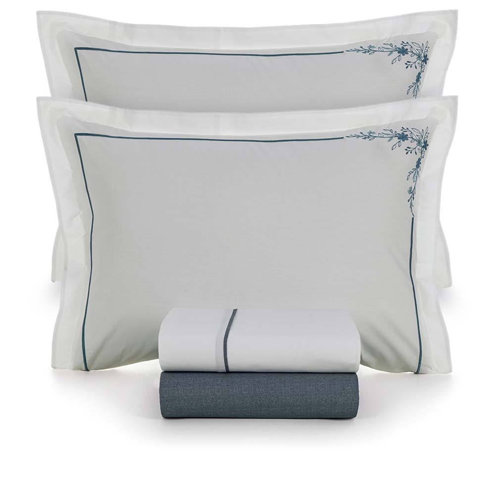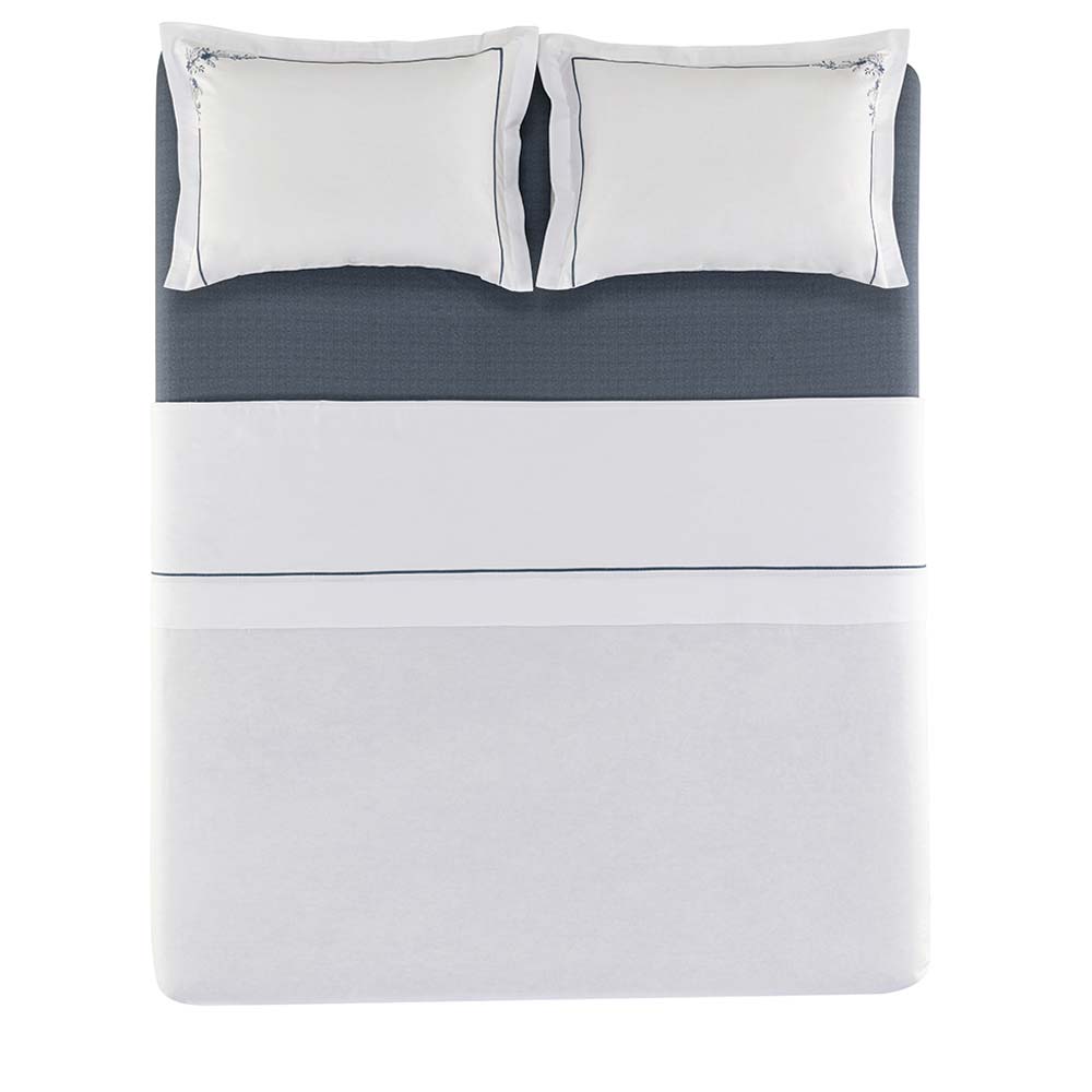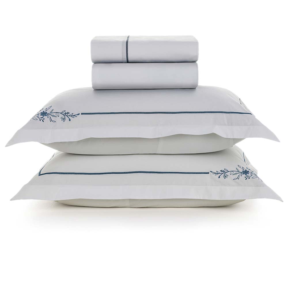 Confeccionado em 100% algodão 200 fios, este modelo oferece um toque macio e encorpado, além de ser altamente respirável, hipoalergênico e antipilling para maior durabilidade e cuidado com a pele. Combinando tecido tinto e bordado, a versão 4 peças do jogo de cama Helen apresenta uma proposta visual elaborada e feminina. As fronhas têm bordado em ponto royal e flores delicadas, enquanto o sobre lençol ganha destaque com filete aplicado. A cama Helen conta sua base branca, detalhes em tom de azul mais sóbrio e toques de azul claro. Uma escolha que une romantismo e personalidade. Foto meramente ilustrativa. Contém: 1 lençol de cima 240x250cm 1 lençol ajustável 158x198x40cm 2 fronhas 50x70cm INSTRUÇÕES DE LAVAGEM KARSTEN • Lavar com temperatura máxima de 60°C; • Não alvejar; • Secar em tambor com temperatura máxima de 60ºC; • Passar com temperatura máxima de 150ºC; • Não limpar a seco; Dicas de conservação Catran: - Siga sempre as instruções de lavagem e conservação dispostas na etiqueta ou embalagem do produto. -30%