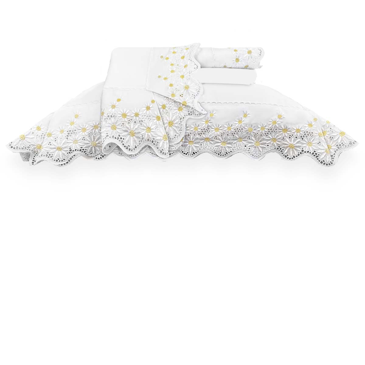 Confeccionado em tecido acetinado 300 fios, 100% algodão, fio egípcio. As Margaridas são flores geralmente associadas a significados positivos como pureza, inocência e ao amor verdadeiro. As brancas são versáteis e combinam com qualquer ambiente. Conhecidas como "flores de pérola" (do grego margarites), representam também a juventude, novos começos e a sensibilidade, sendo frequentemente associadas à energia solar e à renovação por abrirem suas pétalas ao amanhecer. O jogo de cama 4 peças compreende lençol dobra feita com aplicação de bordado, lençol com elástico e fronhas 3 abas com aplicaçãode bordado. Perfeito para quem busca uma decoração impecável e bem-estar durante as noites de sono. Foto meramente ilustrativa.