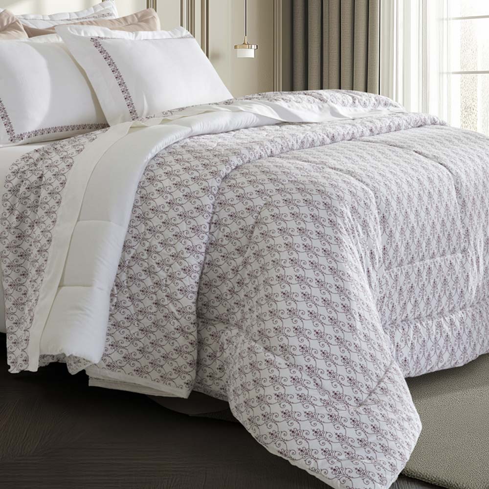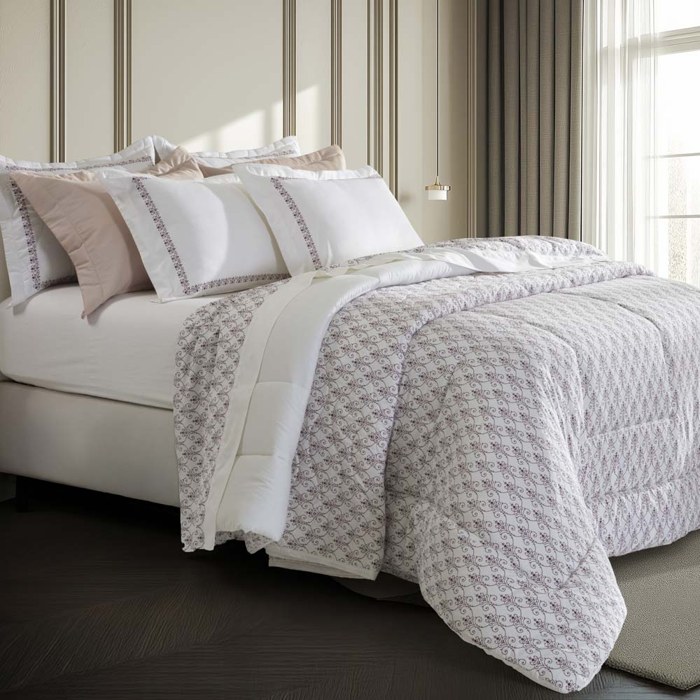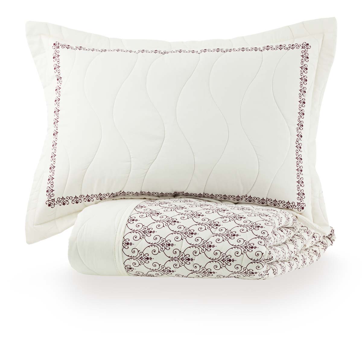 As colchas da linha Satinée Kacyumara são confeccionadas sobre a base exuberante do tecido de algodão egípcio naturalmente hipoalergênico, percal 300 fios e enchimento 100% poliéster com gramatura de 80g/m². Leva tratamento especial que confere um toque de seda e conta ainda com propriedade anti-pilling evitando que o tecido forme bolinhas. A estampa Nissi traduz elegância em sua composição, seus detalhes de arabescos em tom vinho contribuem para uma sensação de profundidade que eleva o conjunto. Seu kit colcha 2 peças é composto por cobre leito dupla face matelado estampado com acabamento em viés por toda a borda; Porta-travesseiro 4 abas matelado com estampa exclusiva localizada. Perfeita para deixar a cama muito mais bonita e arrumada! Foto meramente ilustrativa.