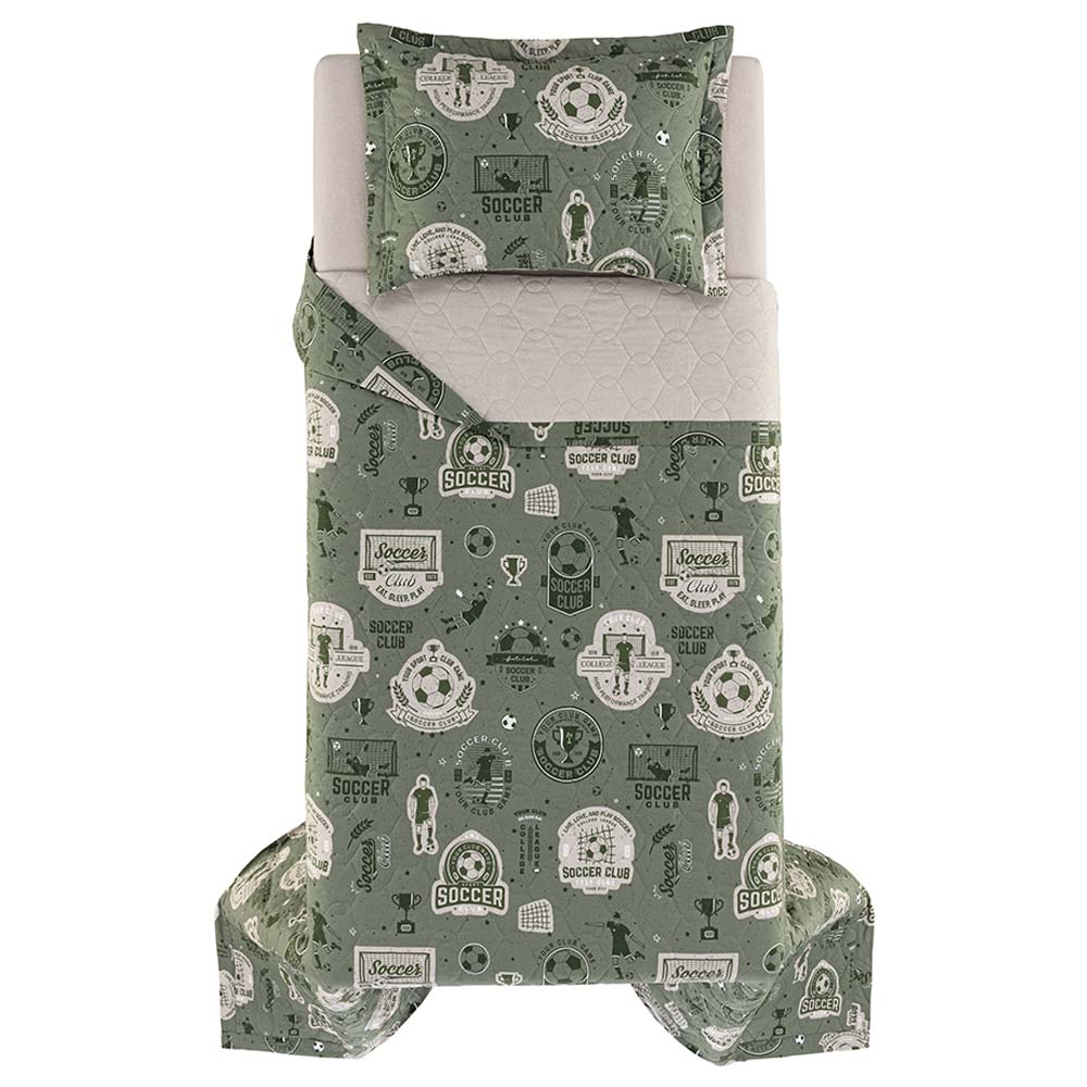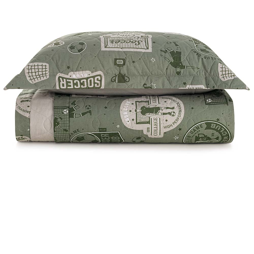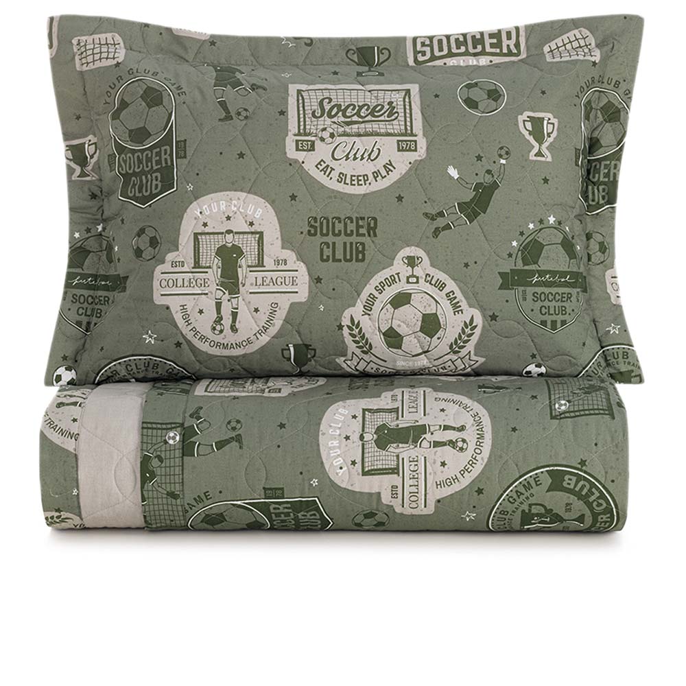 Confeccionada em tecido 100% algodão, fio penteado, percal 200 fios e enchimento thermobonder 100% poliéster com gramatura de 118g/m². De tecido bem encorpado, altamente respirável e com tecnologia antipilling, garantindo durabilidade e toque macio. Além disso, é hipoalergênica, ideal para proporcionar noites de sono tranquilo e saudável. A colcha Futebol oferece conforto e estilo com temática esportiva. A frente apresenta uma composição rica em detalhes, com cenas de jogo, personagens e bola em movimento. O verso traz uma estampa suave em tom bege, proporcionando versatilidade para variar o visual da cama. O porta-travesseiro acompanha com estampa coordenada e acabamento cuidadoso. Com enchimento leve e textura agradável, é ideal para transformar o quarto em um espaço lúdico e cheio de personalidade. Foto meramente ilustrativa. Contém: 1 colcha 180x260cm 1 porta-travesseiros com abas 50x70cm INSTRUÇÕES DE LAVAGEM KARSTEN • Lavar com temperatura máxima de 40°C; • Não alvejar; • Secar em tambor com temperatura máxima de 60ºC; • Passar com temperatura máxima de 110ºC; • Não limpar a seco; Dicas de conservação Catran: - Siga sempre as instruções de lavagem e conservação dispostas na etiqueta ou embalagem do produto. Colcha Solteiro 200 Fios Futebol - Karsten De R$ 439,00 Por R$ 417,05à vista com 5% de desconto no boleto/pix R$ 439,00no cartão em até 10x de R$ 43,90