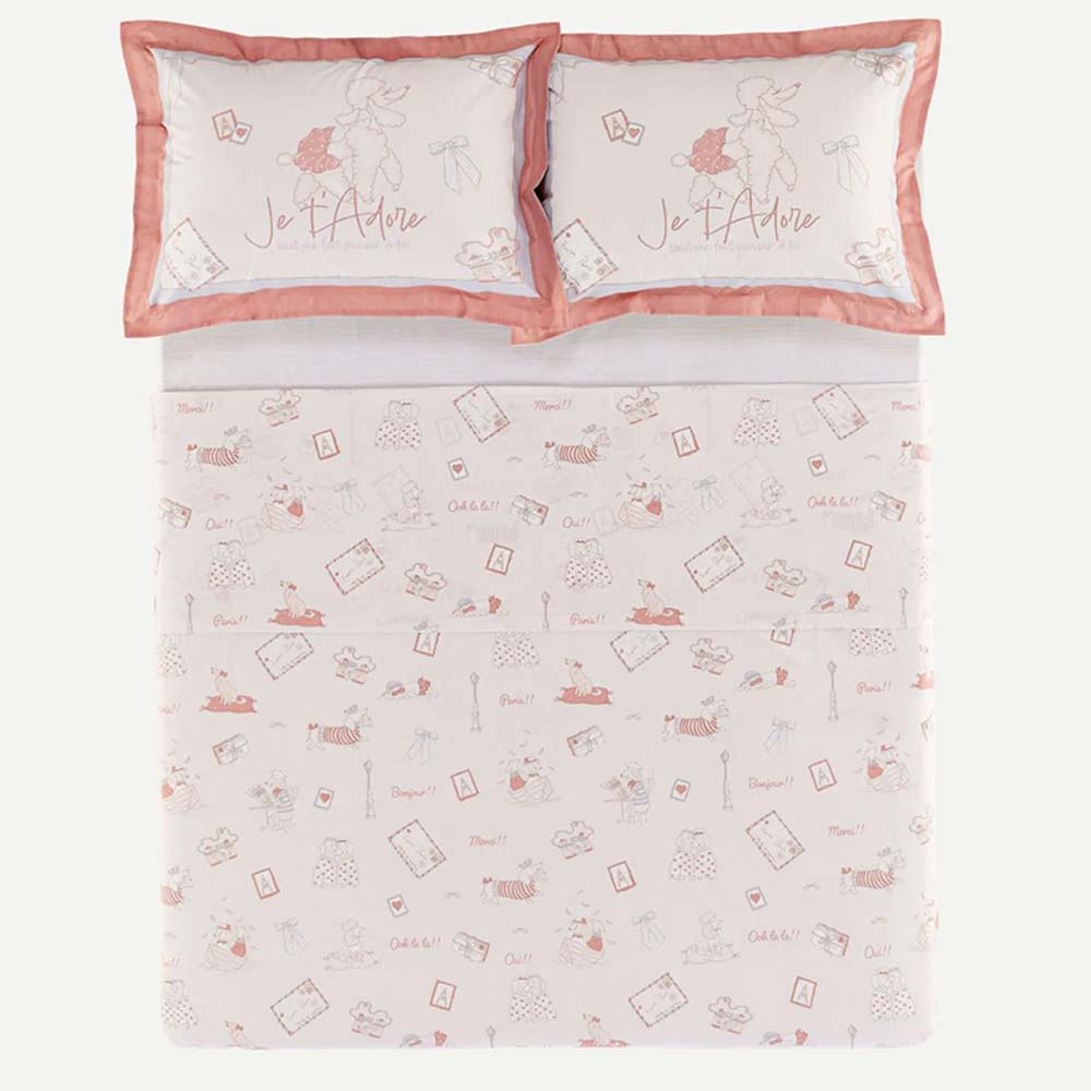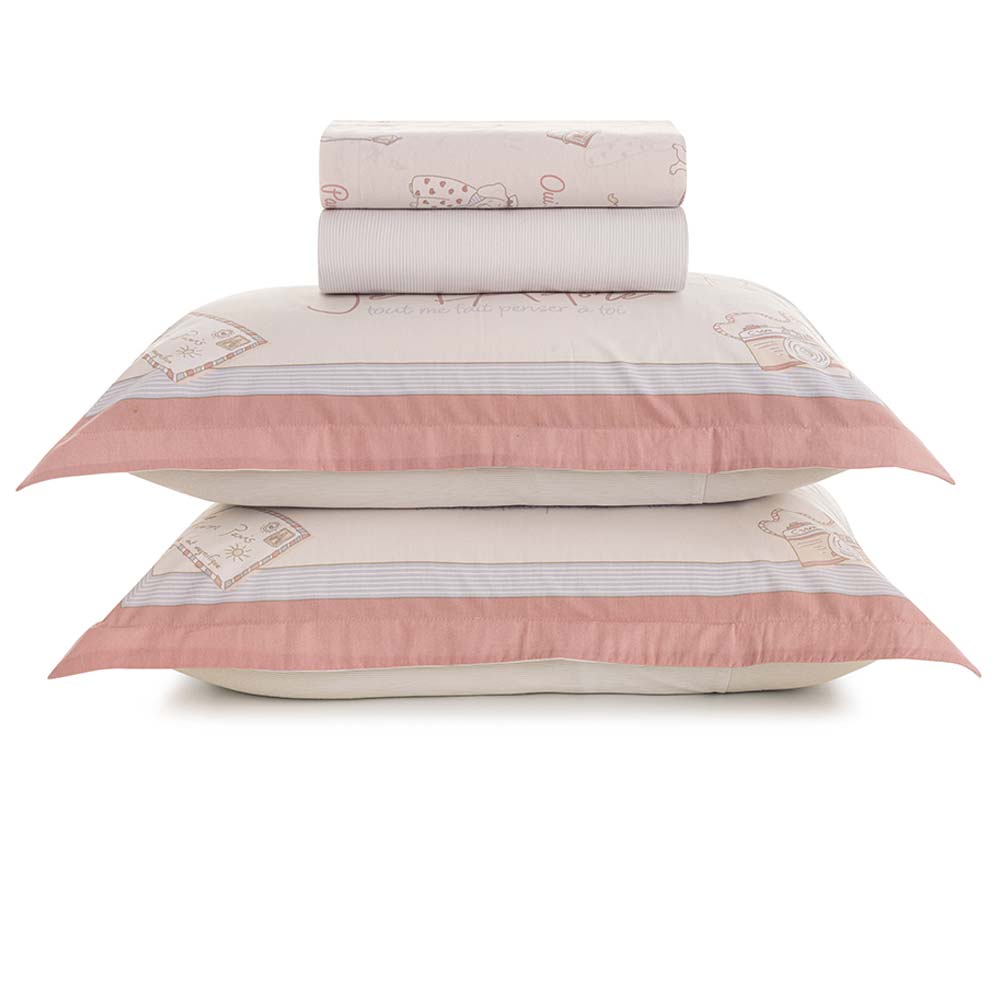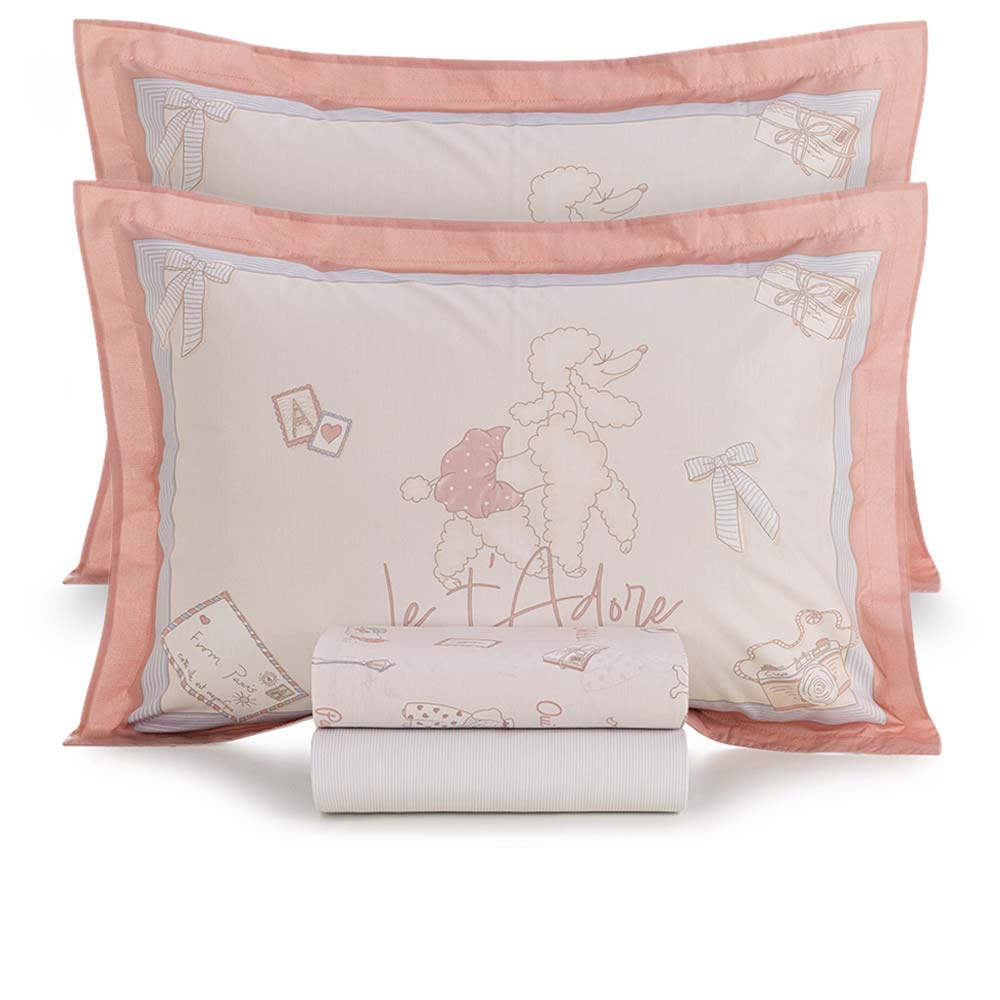Confeccionado em 100% algodão 200 fios, este modelo oferece um toque macio e encorpado, além de ser altamente respirável, hipoalergênico e antipilling para maior durabilidade e cuidado com a pele. Inspirado no charme parisiense, o jogo de cama Infantil Jolie encanta com sua estampa de cachorrinhos adoráveis, laços e cartões-postais delicados. A fronha dimensionada e o sobre lençol em tom rosado criam uma atmosfera romântica e divertida. O lençol com elástico tem padronagem listrada em azul, adicionando contraste moderno e elegante. Composta por elementos lúdicos e suaves, essa peça proporciona conforto e estilo para o quarto infantil, sendo ideal para uma decoração delicada e cheia de personalidade. Foto meramente ilustrativa. Contém: 1 lençol de cima 220x250cm 1 lençol ajustável 138x188x35cm 2 fronhas 50x70cm INSTRUÇÕES DE LAVAGEM KARSTEN • Lavar com temperatura máxima de 60°C; • Não alvejar; • Secar em tambor com temperatura máxima de 60ºC; • Passar com temperatura máxima de 150ºC; • Não limpar a seco; Dicas de conservação Catran: - Siga sempre as instruções de lavagem e conservação dispostas na etiqueta ou embalagem do produto. Jogo de Cama Casal 200 Fios Jolie - Karsten De R$ 439,00 Por R$ 417,05à vista com 5% de desconto no boleto/pix R$ 439,00no cartão em até 10x de R$ 43,90