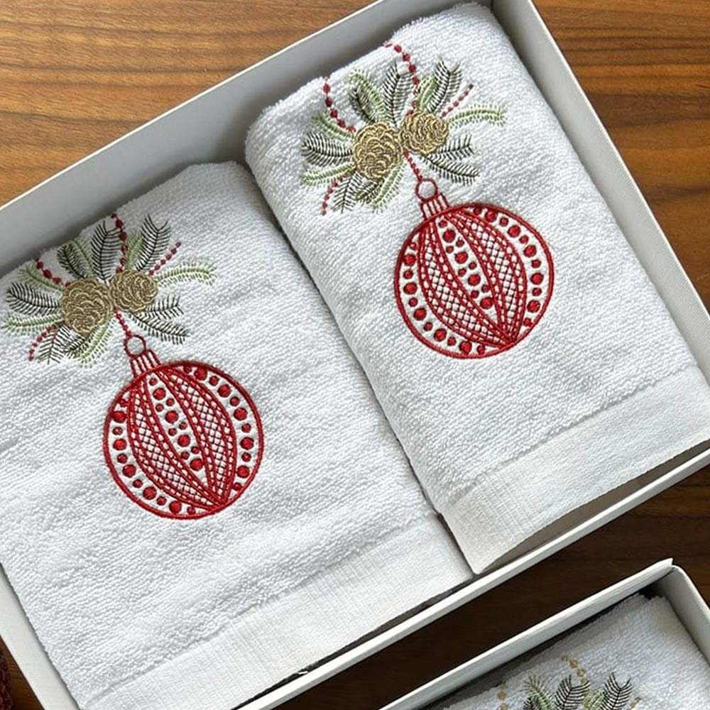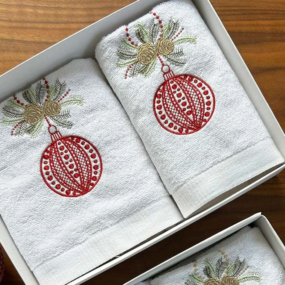Confeccionado em tecido 100% algodão e gramatura de 480g/m² com bordado de bola vermelha. Toalhas pré-lavadas e pré-encolhidas, o que amplia a maciez, resistência e poder de absorção, Além de ajudar a preservar o aspecto de novo e a aumentar a durabilidade. Com acabamento bordado em cores vibrantes e detalhes delicados, traz um toque especial de cuidado e carinho à decoração. Além de belo, sua feupa oferece conforto ao toque e excelente capacidade de absorção. Um toque de conforto e sofisticação que o seu banheiro merece na época mais acolhedora do ano: O Natal! É a opção perfeita para quem busca qualidade e requinte. Foto meramente ilustrativa. Contém: 1 toalha de rosto 50x80cm 1 toalha de lavabo 30x50cm INSTRUÇÕES DE LAVAGEM MARKEN FASSI • Lavar em temperatura de até 60°C. Processo suave; • Lavar com sabão neutro; • Não usar alvejante; • Não secar em tambor; • Passar até 110°C; Sobre os bordados passar até 80°C; • Não limpar a seco.