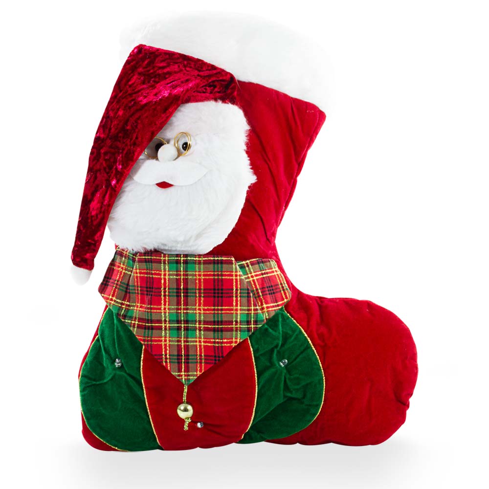 Confeccionada em gorgurinho veludo 100% poliéster. Bota ou meia natalina vermelha com Papai Noel de óculos e vivo dourado aplicado. Possui módulo de luz com 3 pontos LEDs alimentado por duas pilhas (AA) não inclusas, um chocalho e borda felpuda branca. Surpreenda seus convidados com brilho e modernidade na festa. Perfeita para decorar a sua mesa na época festiva! Foto meramente ilustrativa.